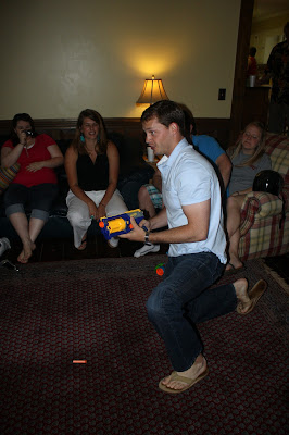 This was indeed the case at our "brunch" the day after the wedding. All of our family was still in town and I had them over for a VERY informal brunch on Sunday. We were all hanging out after the food and the next thing I knew the guns were coming out and the war began. Here are some shots of the players---not everyone who was playing is pictured---that's too bad! But we do have lots of pictures of two of the Nelson cousins and Joshua. I think in years to come, this will be a highlight of the memories of the wedding--at least for Joshua!